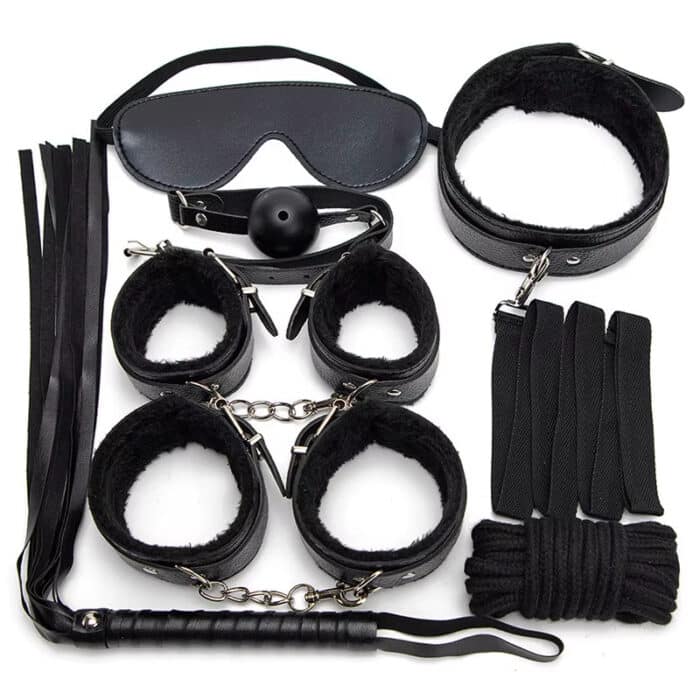Complete 7-Piece Kit – Includes handcuffs, ankle cuffs, collar, leash, blindfold, whip, and rope