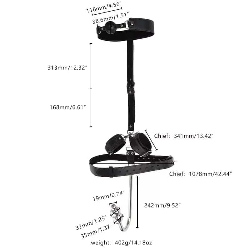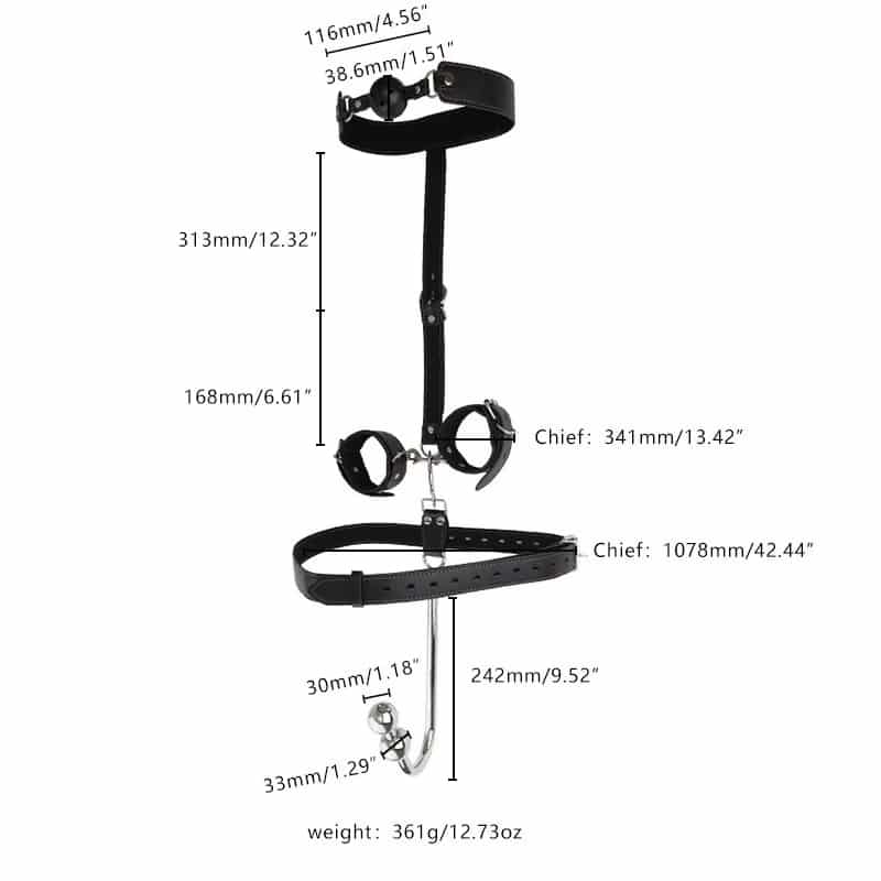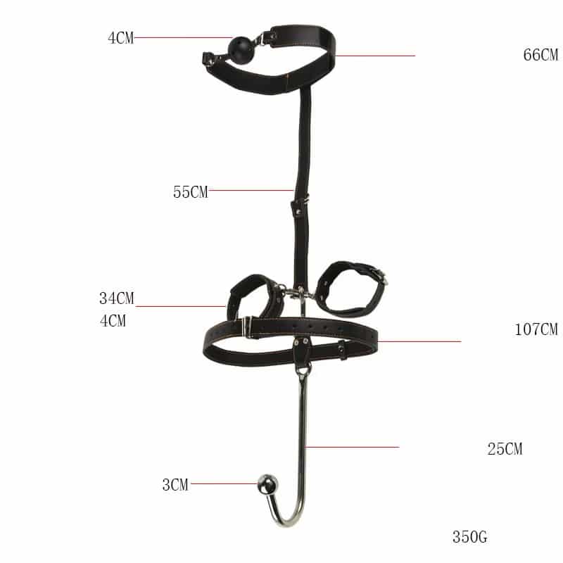 | Components | Adjustable Handcuffs, Neck Collar, Anal Hook, Butt Plug |