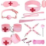 A: The set includes a harness, handcuffs, and collar – all designed to match the nurse roleplay theme.