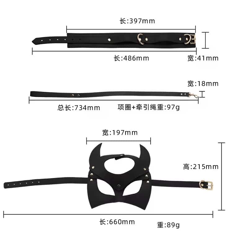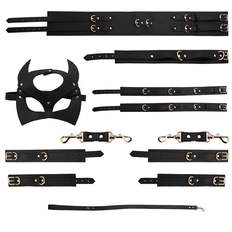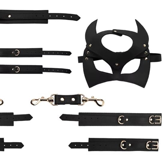 | Components | 7 items – mask, handcuffs, ankle cuffs, rope, whip, collar & leash |