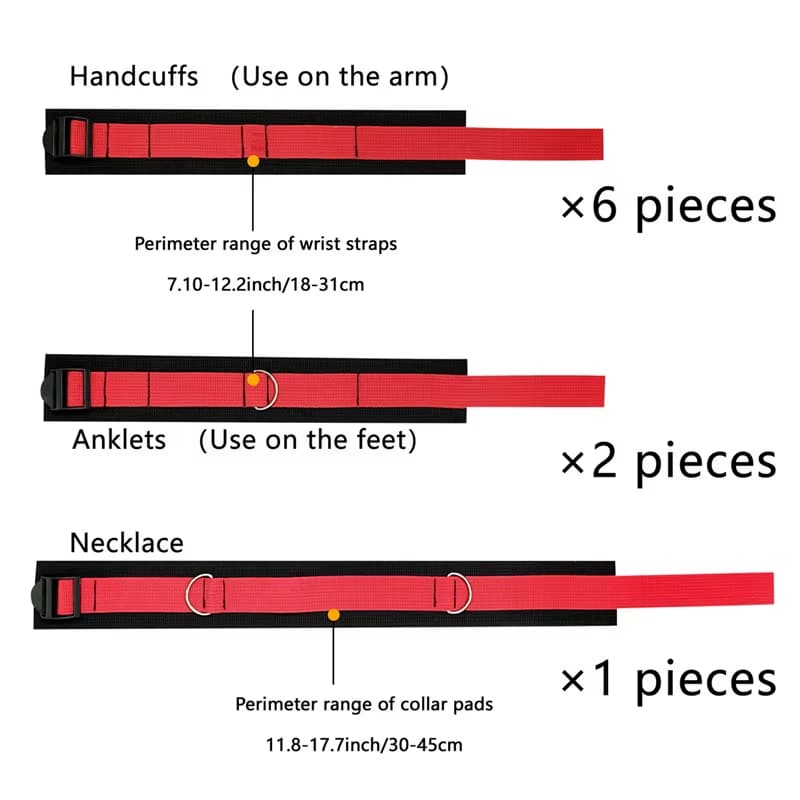 | Material | Soft nylon straps + padded cuffs + metal rings |