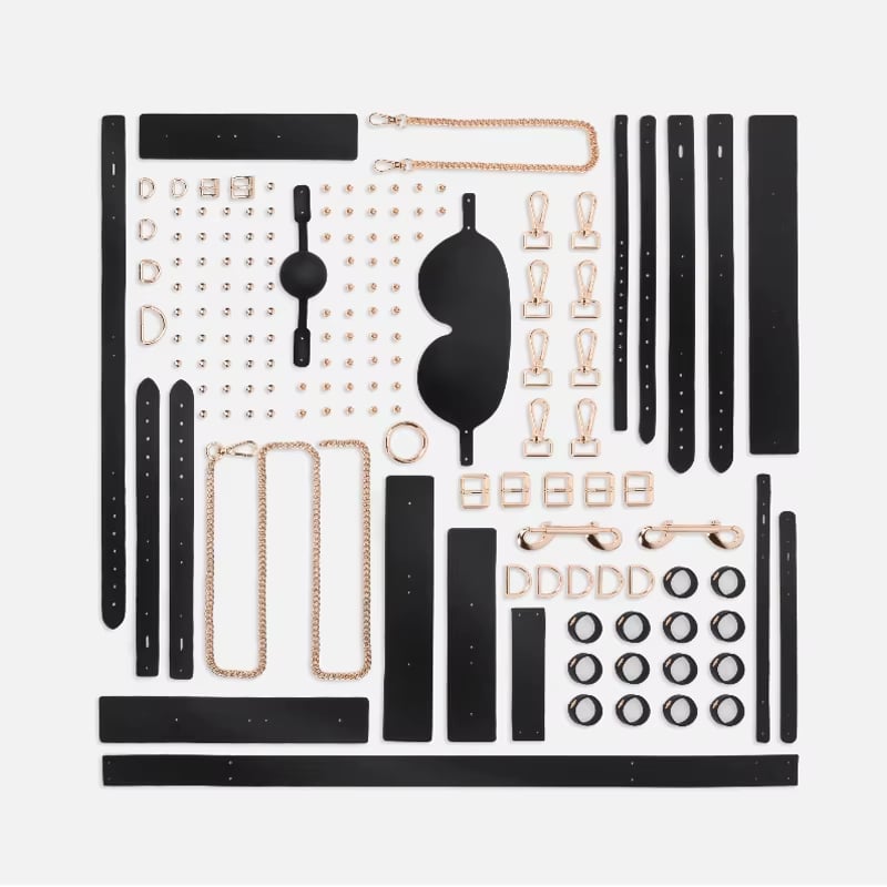 | Components | Paddle, ball gag, handcuffs, ankle cuffs, chains |
