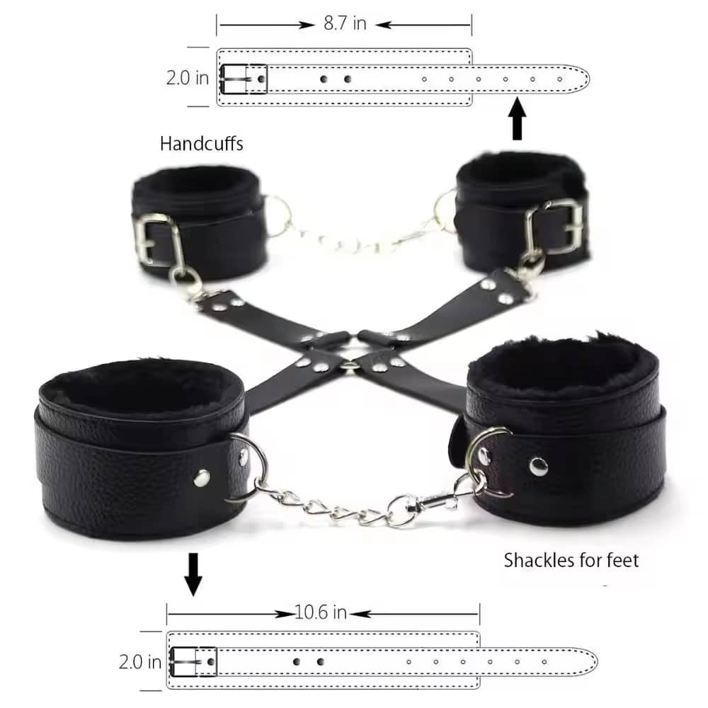 Complete Restraint System – Includes adjustable straps, handcuffs, and ankle cuffs for full-body positioning and control.