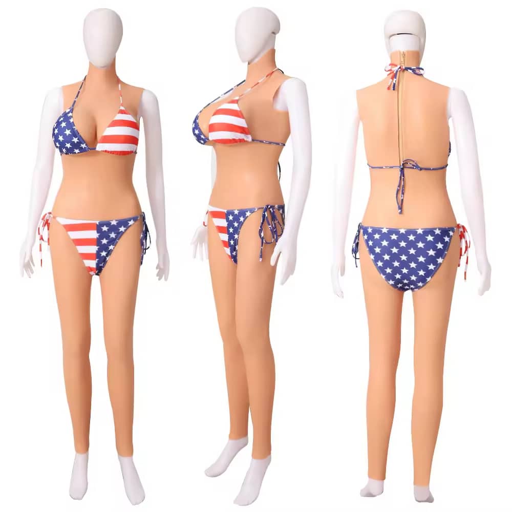Made from high-elastic, medical-grade silicone, this sleeveless jumpsuit replicates the look and feel of real female skin, featuring a built-in vagina and soft breast forms for a natural feminine appearance.