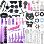| Included Items | 47 pieces including handcuffs, ankle cuffs, collar, blindfolds, gags, ropes, nipple clamps, whip, tickler, and more |